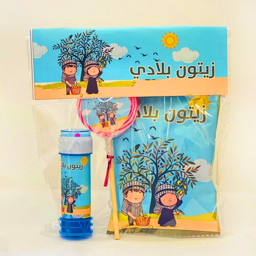 كيس مغلف يحتوي على شيبس ومصاص وفقيعات صابون بتصميم موسم قطف الزيتون